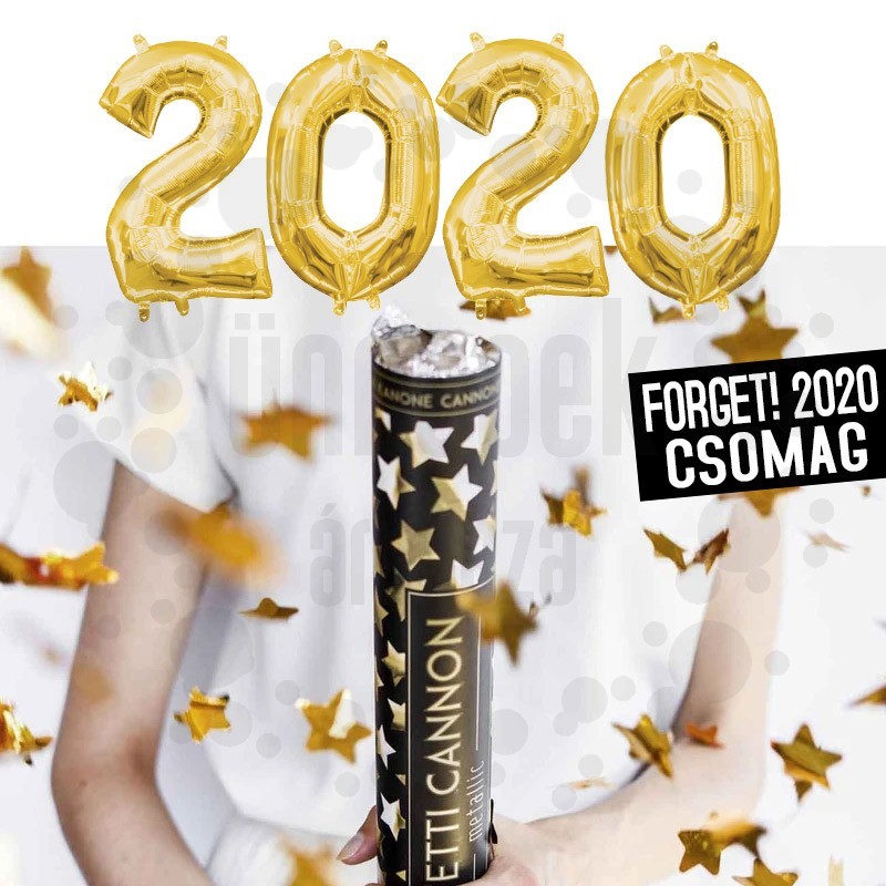 A csomag tartalma: 1 db 40 cm-es arany csillagokat kilövő konfetti ágyú, 4 db szám alakú arany fólia lufi (2020-at mintázó), 1 db 1-es alakú arany fólia lufi. Szalag a felfüggesztéshez.