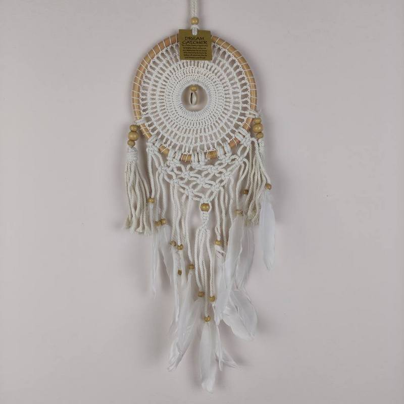 Krém színű álomfogó, melyet a ráhelyezett tollak és kagylók tesznek igazán különlegessé. Az álomfogó kézzel készült, formája és letisztultsága pedig harmóniát teremt a hálószobádba. Az álomfogó a hiedelmek szerint elűzi a rossz álmokat, helyette nyugodt, békés pihenést ígér.
