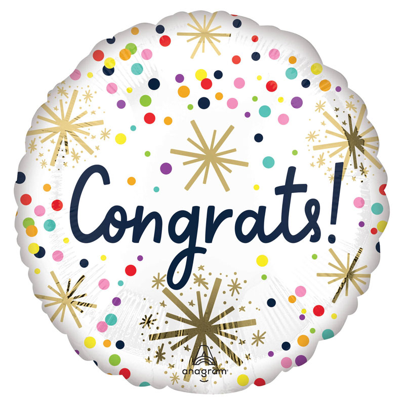 Ünnepeld meg a sikert stílusosan ezzel a konfettis mintájú „Congrats” héliumos fólia lufival! A színes pöttyök és arany csillagszóró minták igazán vidám és elegáns hangulatot teremtenek, legyen szó ballagásról, diplomaosztóról vagy bármilyen különleges alkalomról.